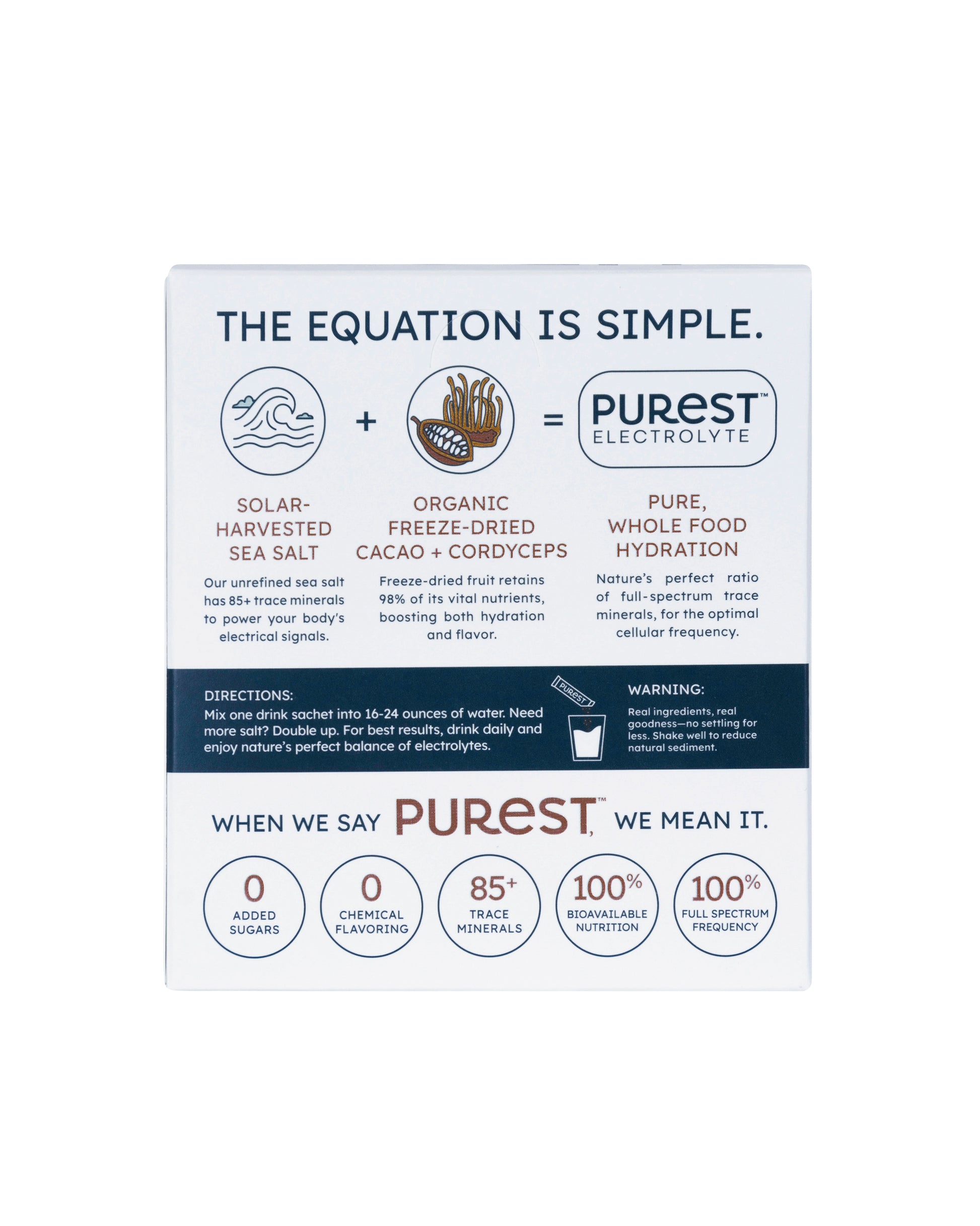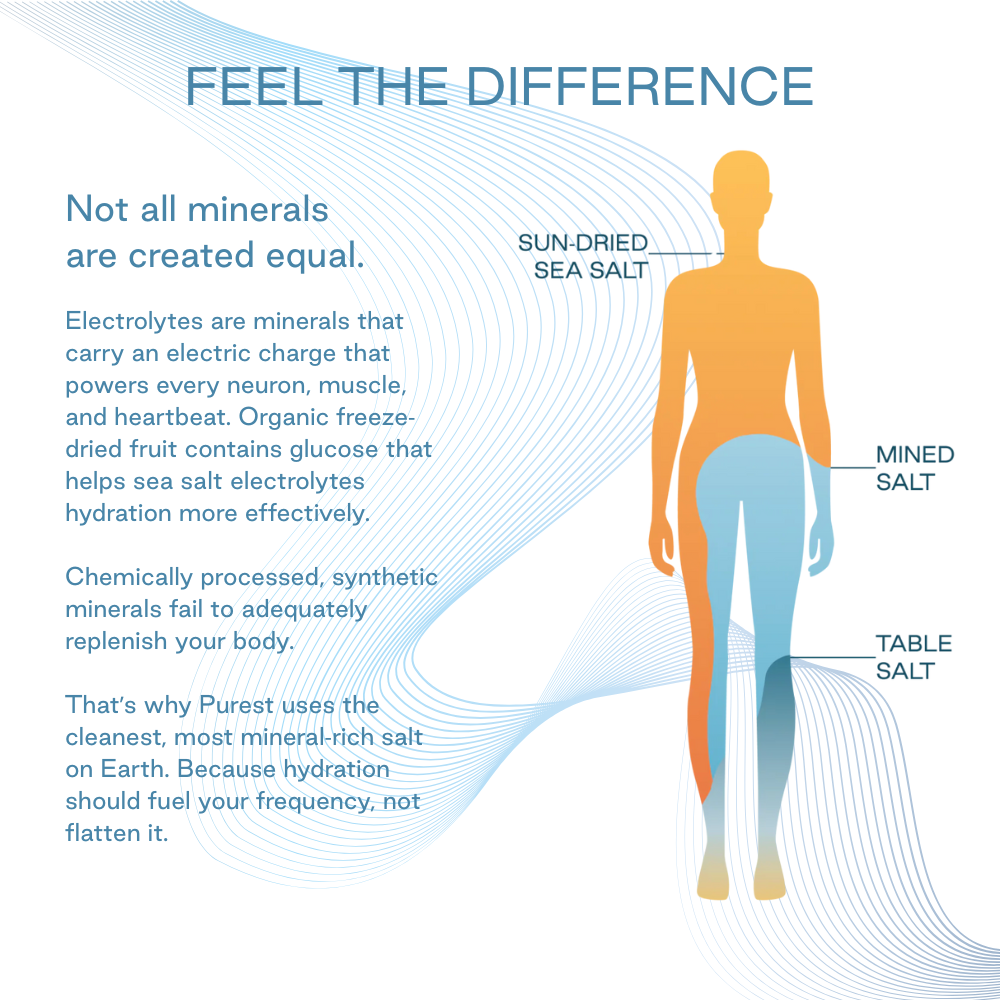 Purest Electrolyte™ is the ONLY complete hydration system that uses a proprietary blend of sun harvested sea salts and freeze-dried fruits to ionize water and efficiently hydrate the body.